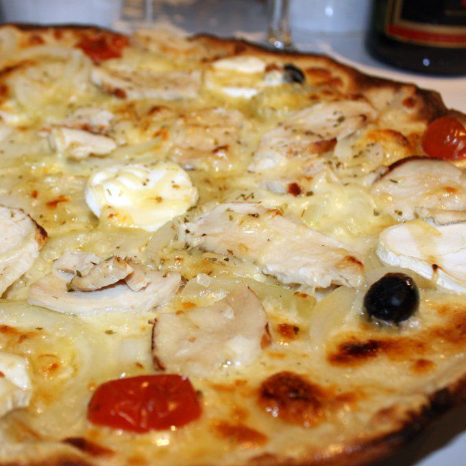 Crème Fraîche, Mozzarella, Poulet, Chèvre, Miel de Pays, Oignons, Olives