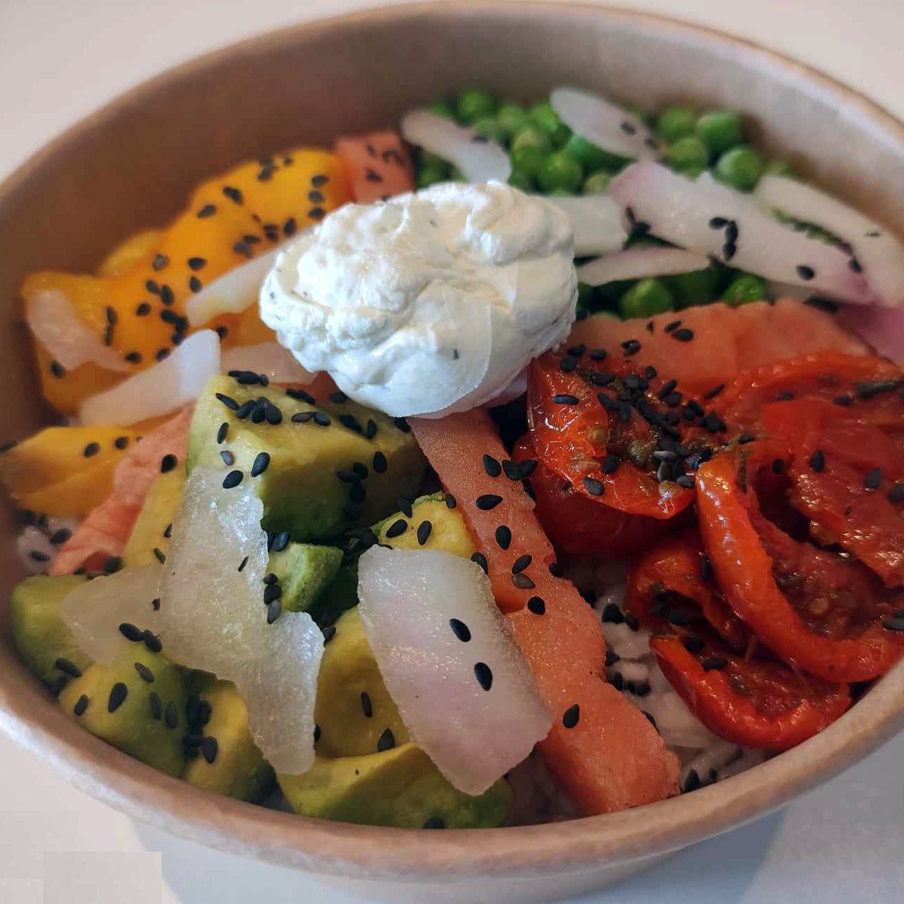Riz Basmati, Filet de Saumon Frais, Avocats, Mangue, Tomate confite, Oignons rouges, Graines de sésame noir, Sauce Soja, Vinaigre Balsamique, Fromage Frais